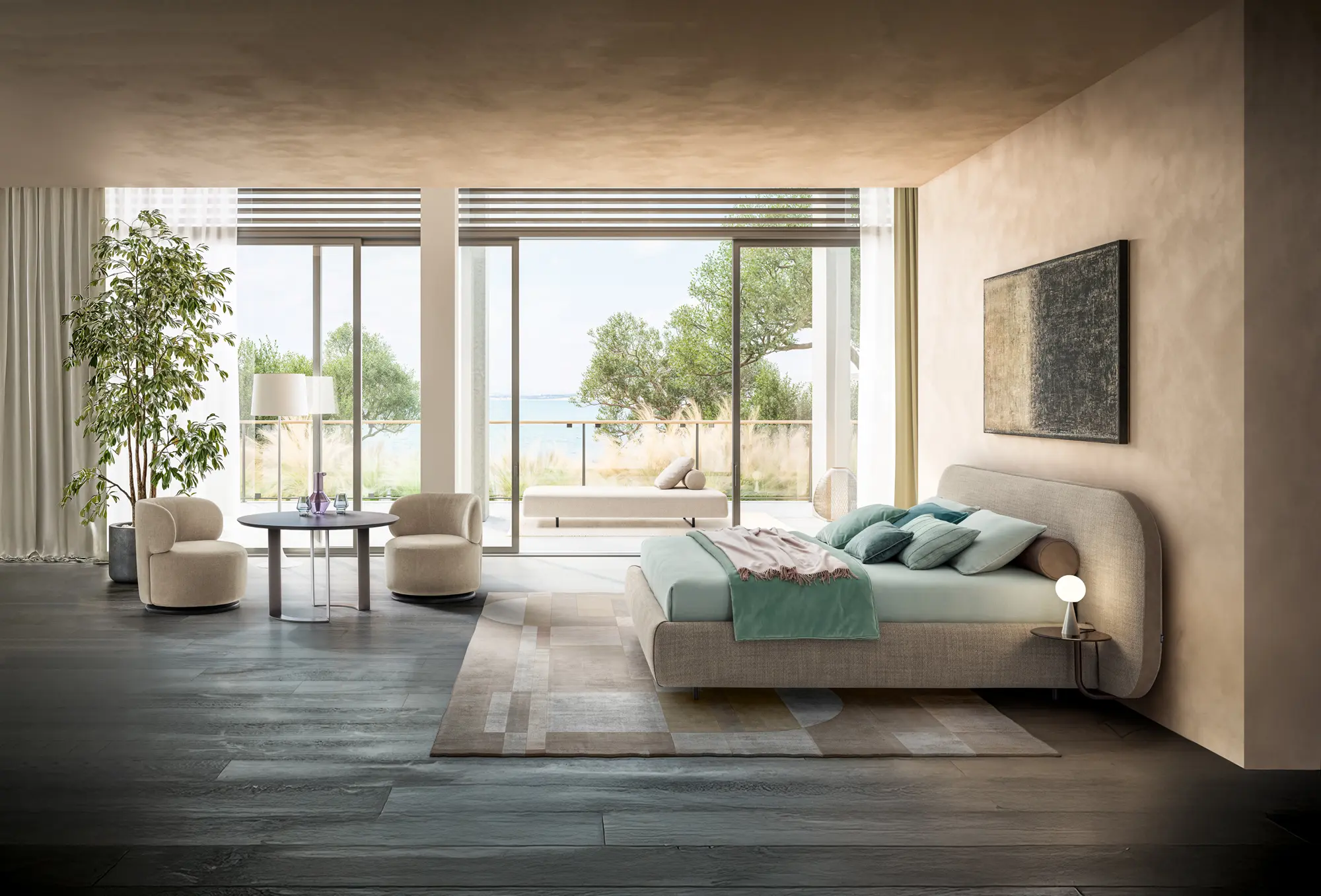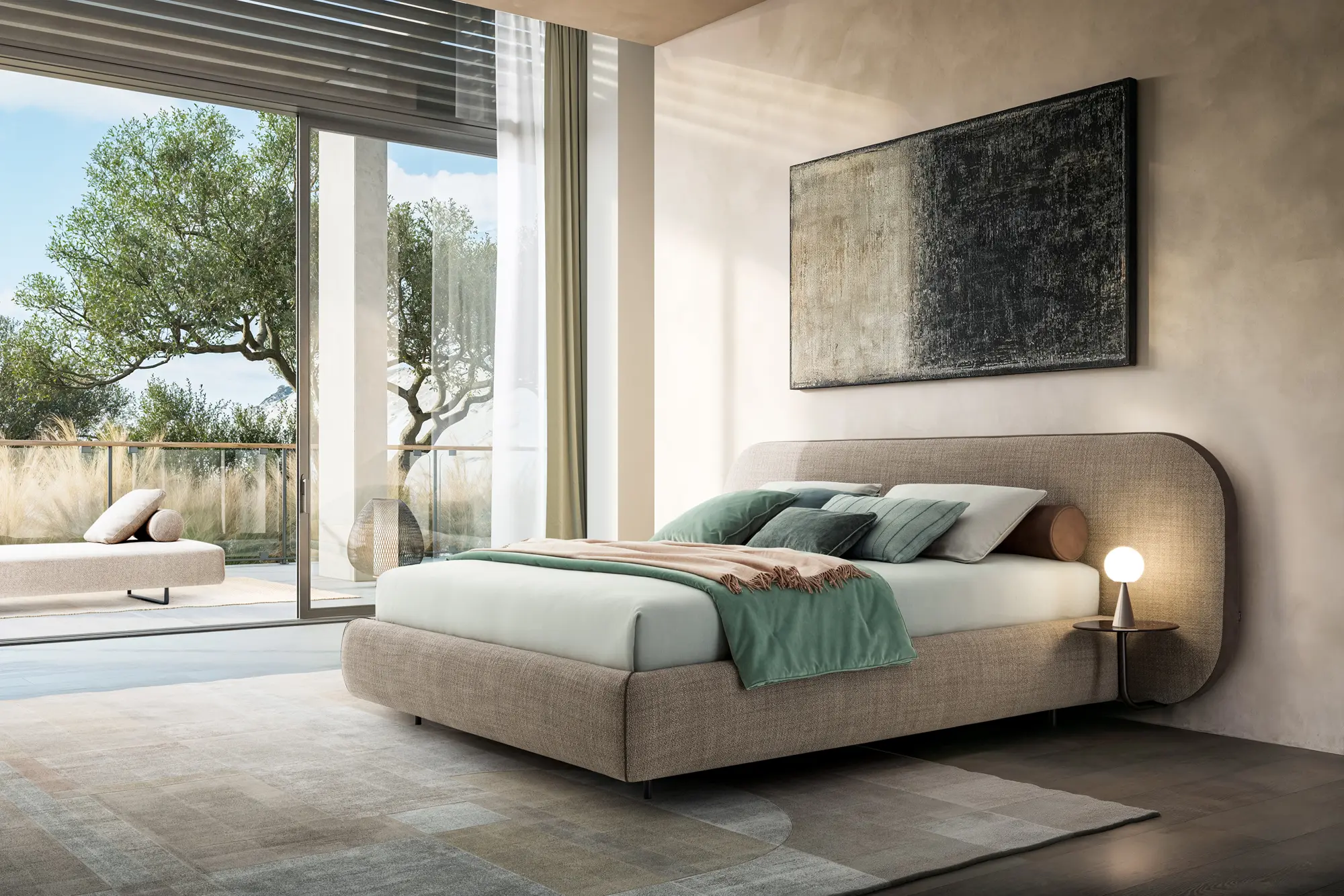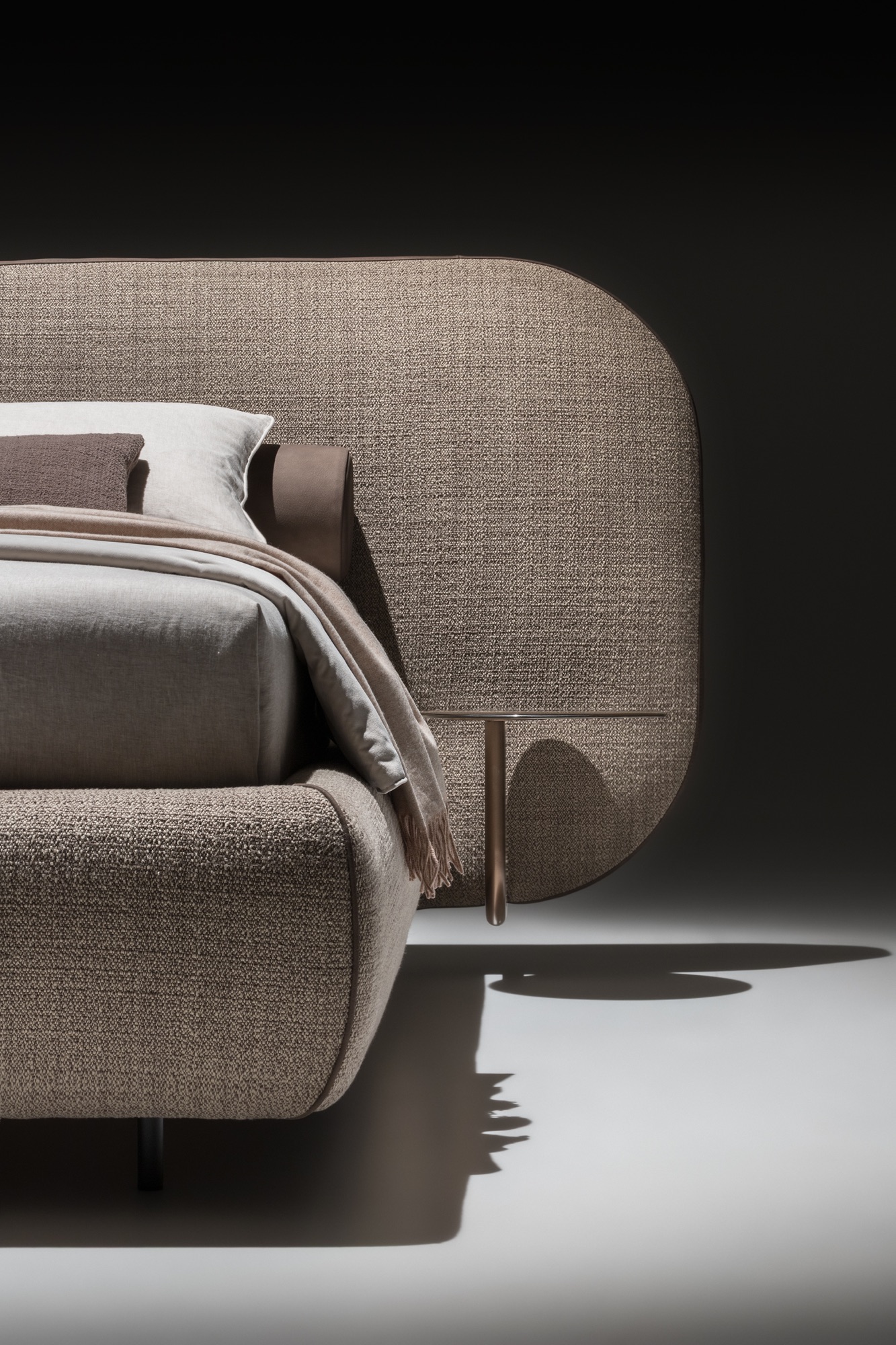 The simplicity of the design and carefully considered proportions also shine through in the subtle B-Curve detailing: the wealth of padding on the headboard and around the bed frame underlines the soft, snug shapes, the leather strip running around the edge of the headboard showcases artisanal skills and an eye for detail, and the accessories designed especially for the bed add an unmistakable touch, while making the purpose they serve plain to see.