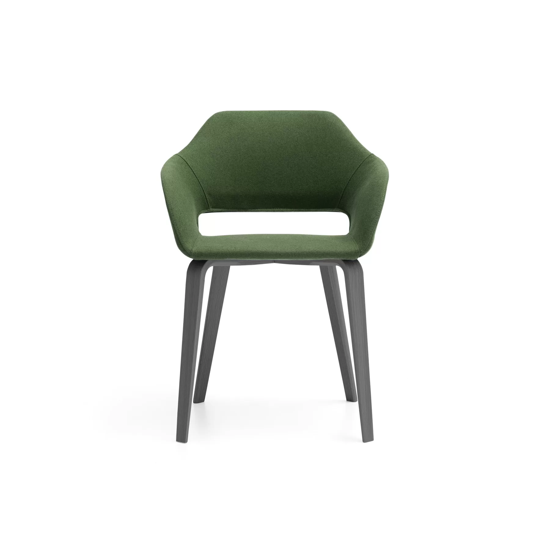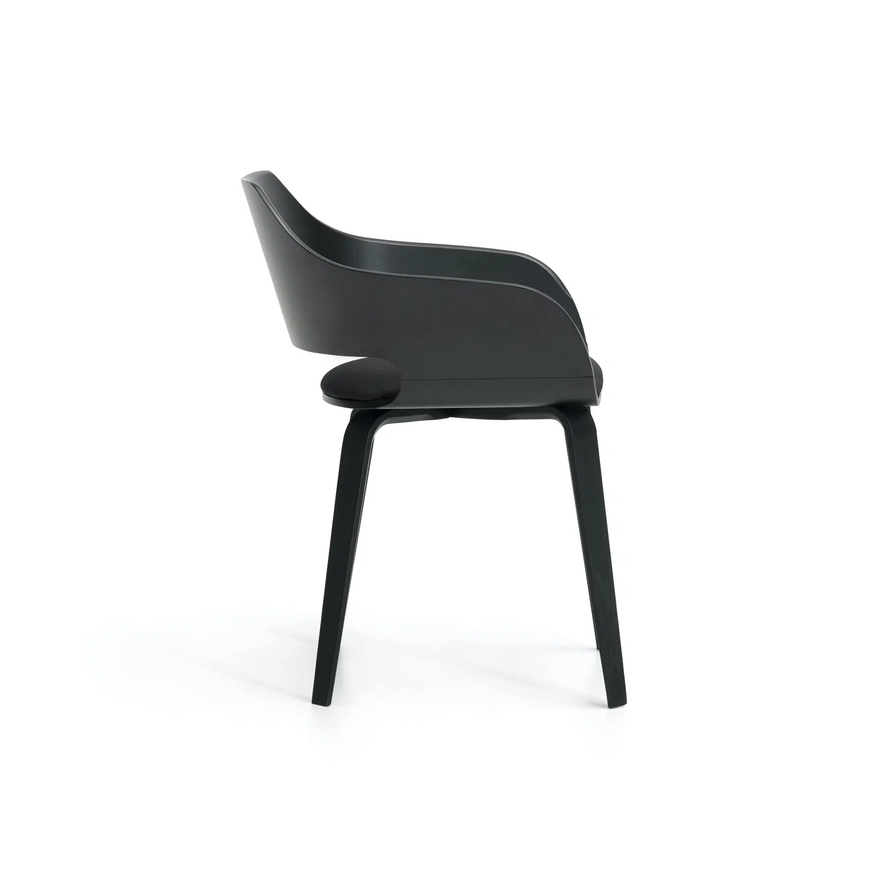The Cima armchair and stool feature a gently curved plywood body that balances modern geometry with ergonomic comfort. The interplay of curves and diagonals creates a dynamic profile, giving the piece a distinctive architectural character.