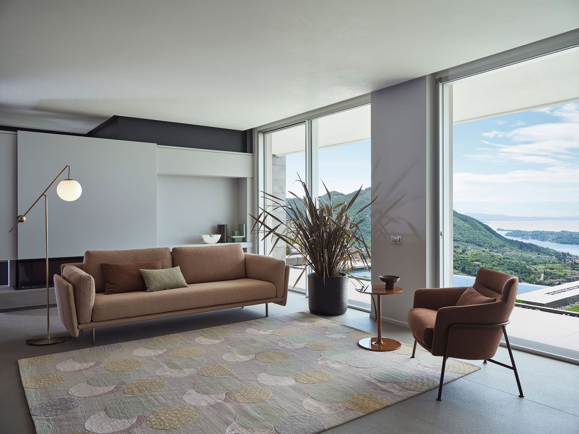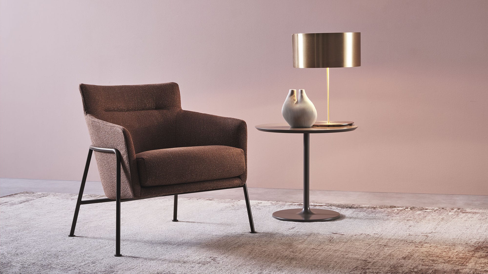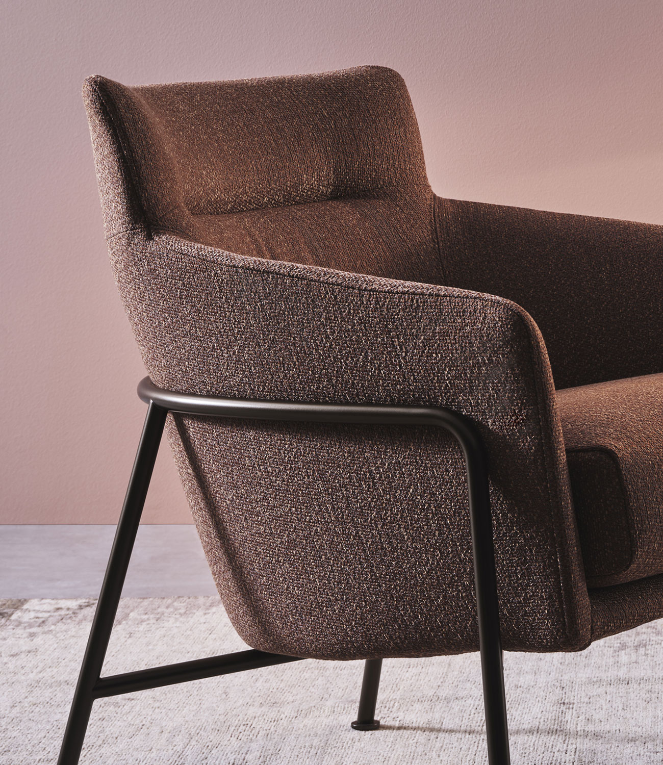 This armchair lives by one rule: simplicity. It reconciles opposites with natural flair, like the frame with its crisp lines and padding for maximum comfort and the different materials used in its construction, enhancing the shapes.