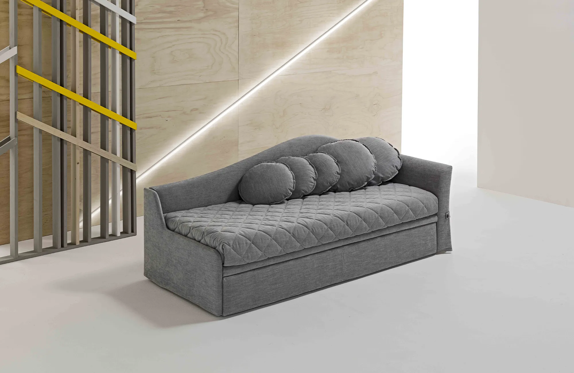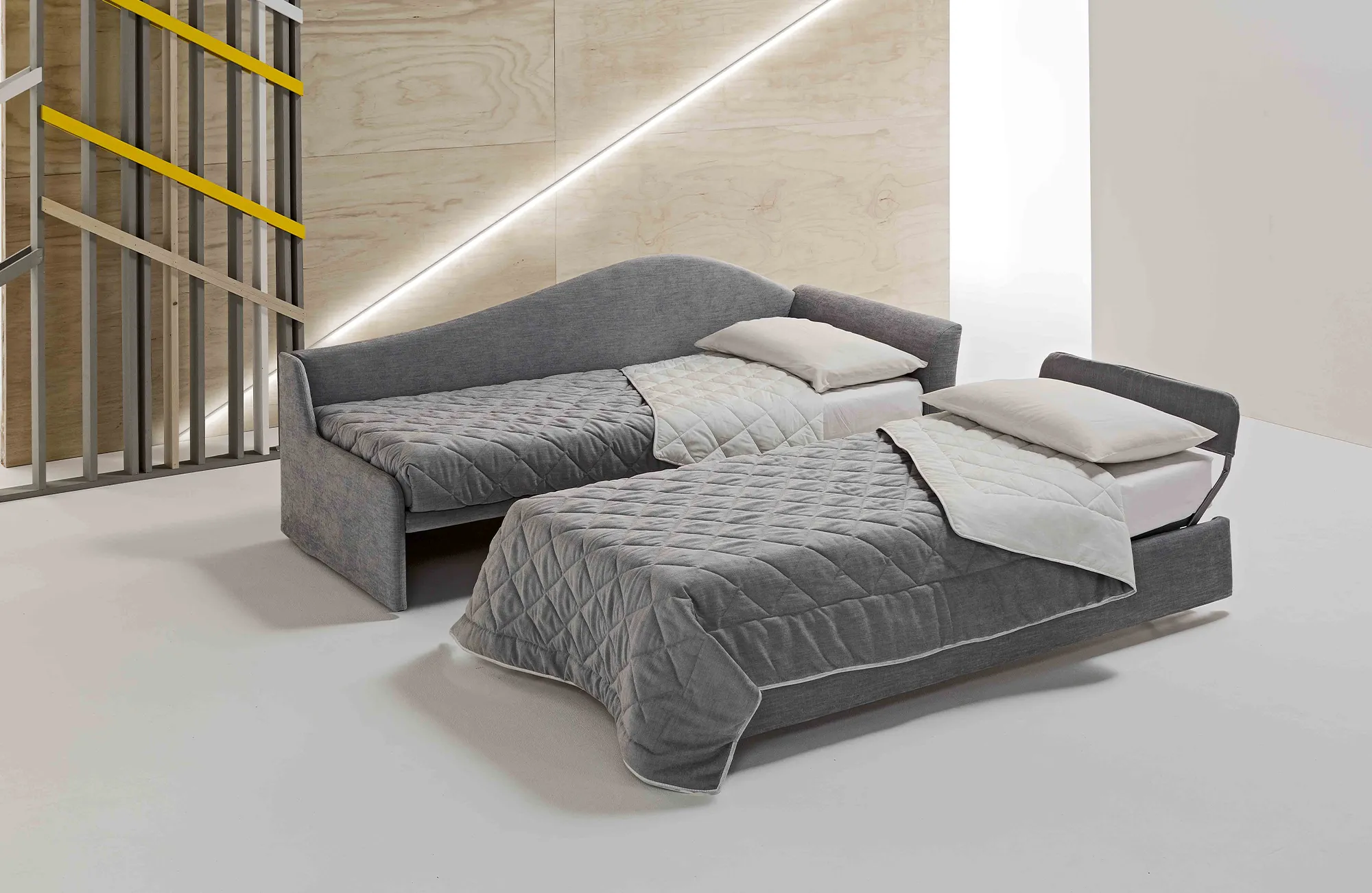 Dalila is the sofa bed with a 16 cm mattress, which is distinguished by its pull-out opening system. With a simple movement, in fact, it transforms into a comfortable double bed.