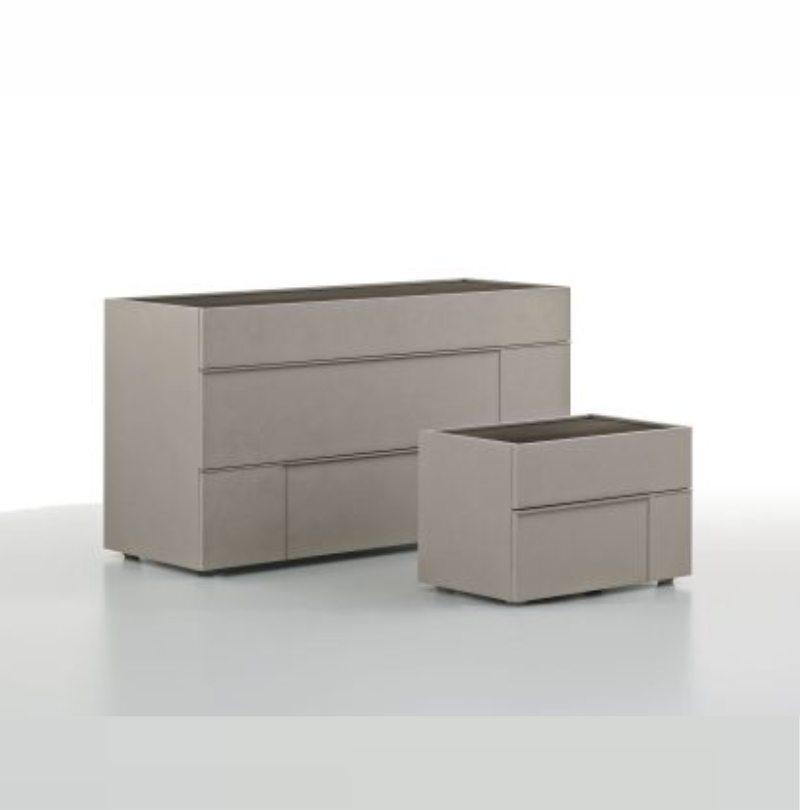Matt ice 173 lacquered bedside tables with ice 173 trims, amber walnut top. Matt tabasco 171 lacquered tall boys with tabasco 171 trims with satin tabasco 471 glass tops.