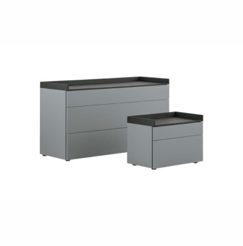 Textured canvas chest-of-drawers, textured amber walnut tray. Textured coal oak bedside tables, textured coal oak trays. Textured matt basalt tall boys, textured matt basalt trays.