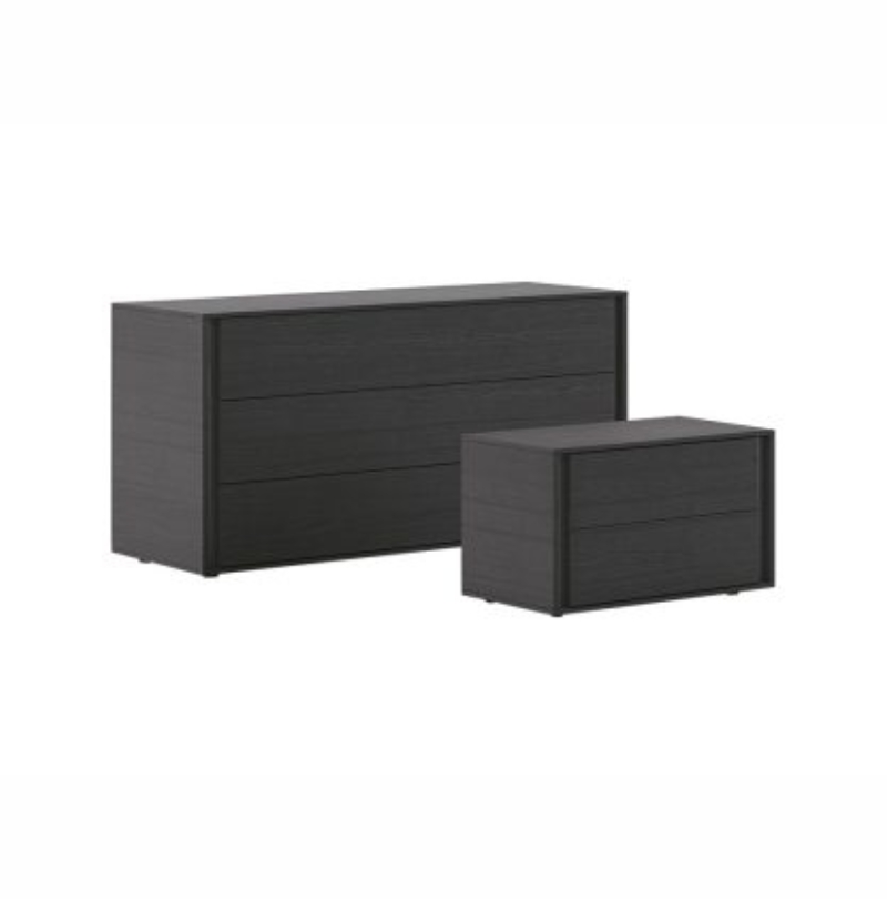 Chest-of-drawers in textured sand oak, matt bromine 176 lacquered grip channel. Matt myrtle 165 lacquered bedside tables and grip channels. Textured matt basalt bedside table, matt basalt 177 lacquered grip channels. Textured coal oak tall boys, mirror 381 grip channels.