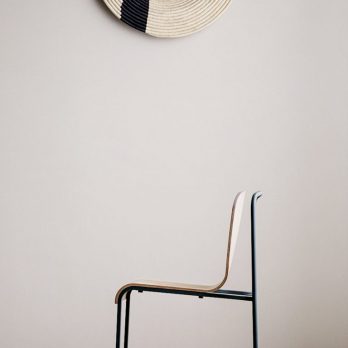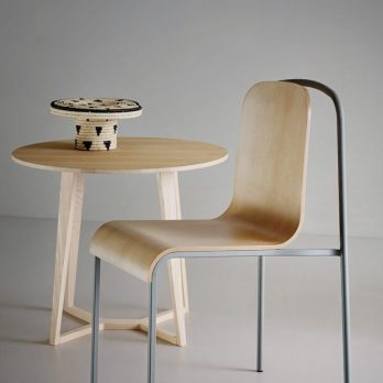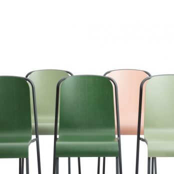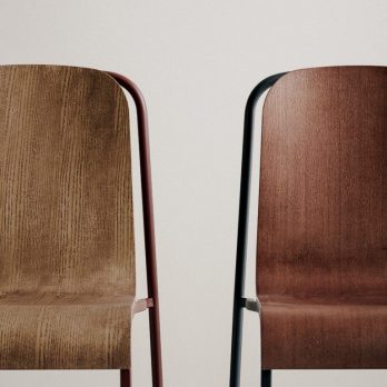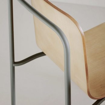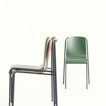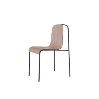 Stackable plywood chair with metal frame. The key element of our model Mue is the metal back frame that acts also as a coat hanger.