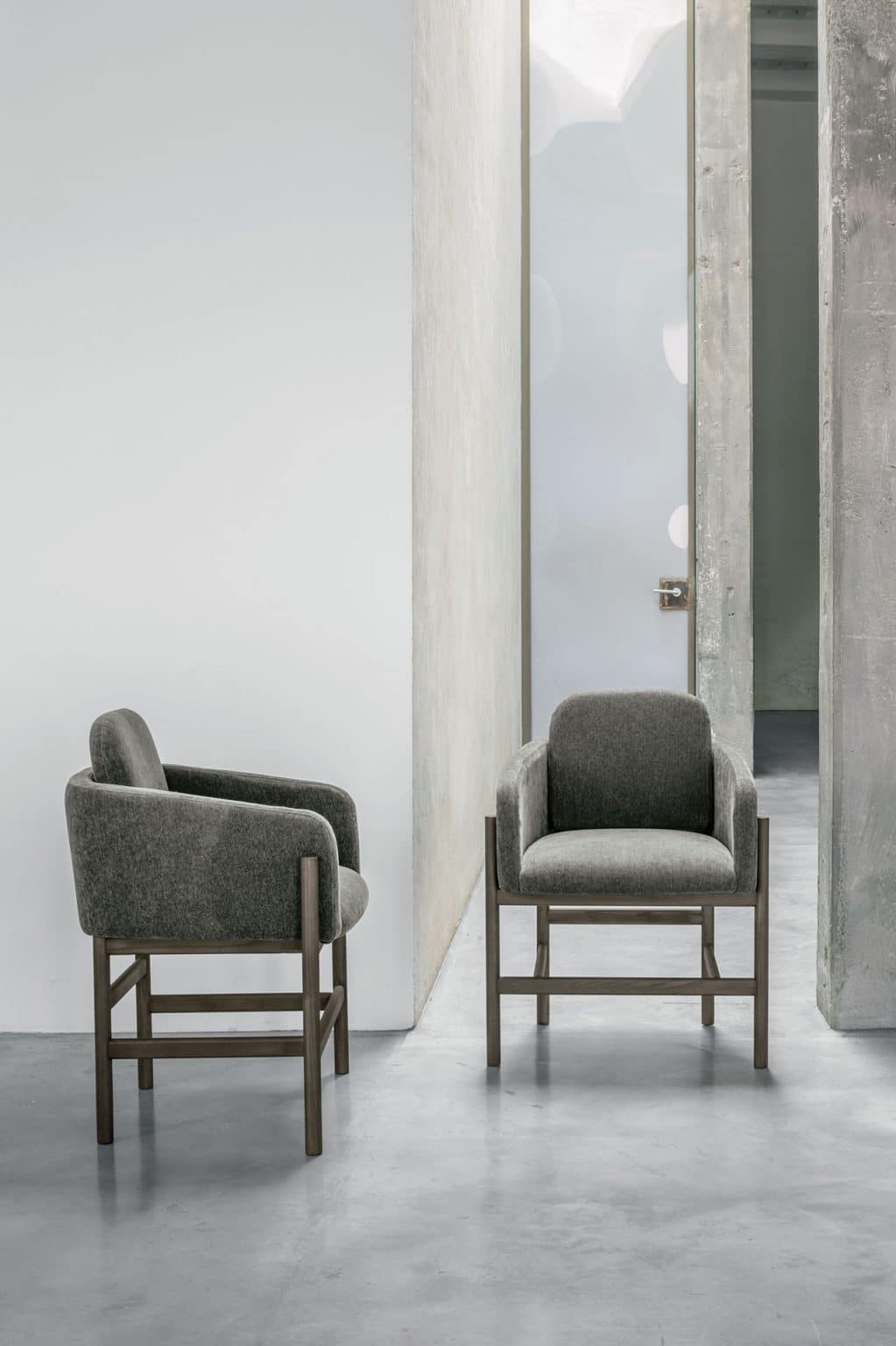 Hood chairs with a mocha oak wood frame upholstered with cat. A boston ash fabric.