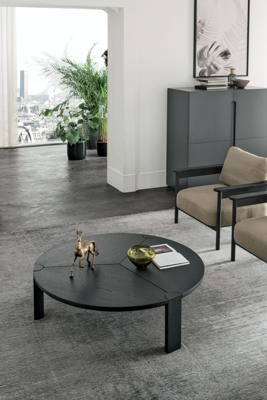 A wooden coffee table that recalls the work of craftsmen: three “segments” are joined to each other and held together by encased legs to form a perfect circle. Combine with a sofa or armchair to enhance the style and practicality of your living room.
