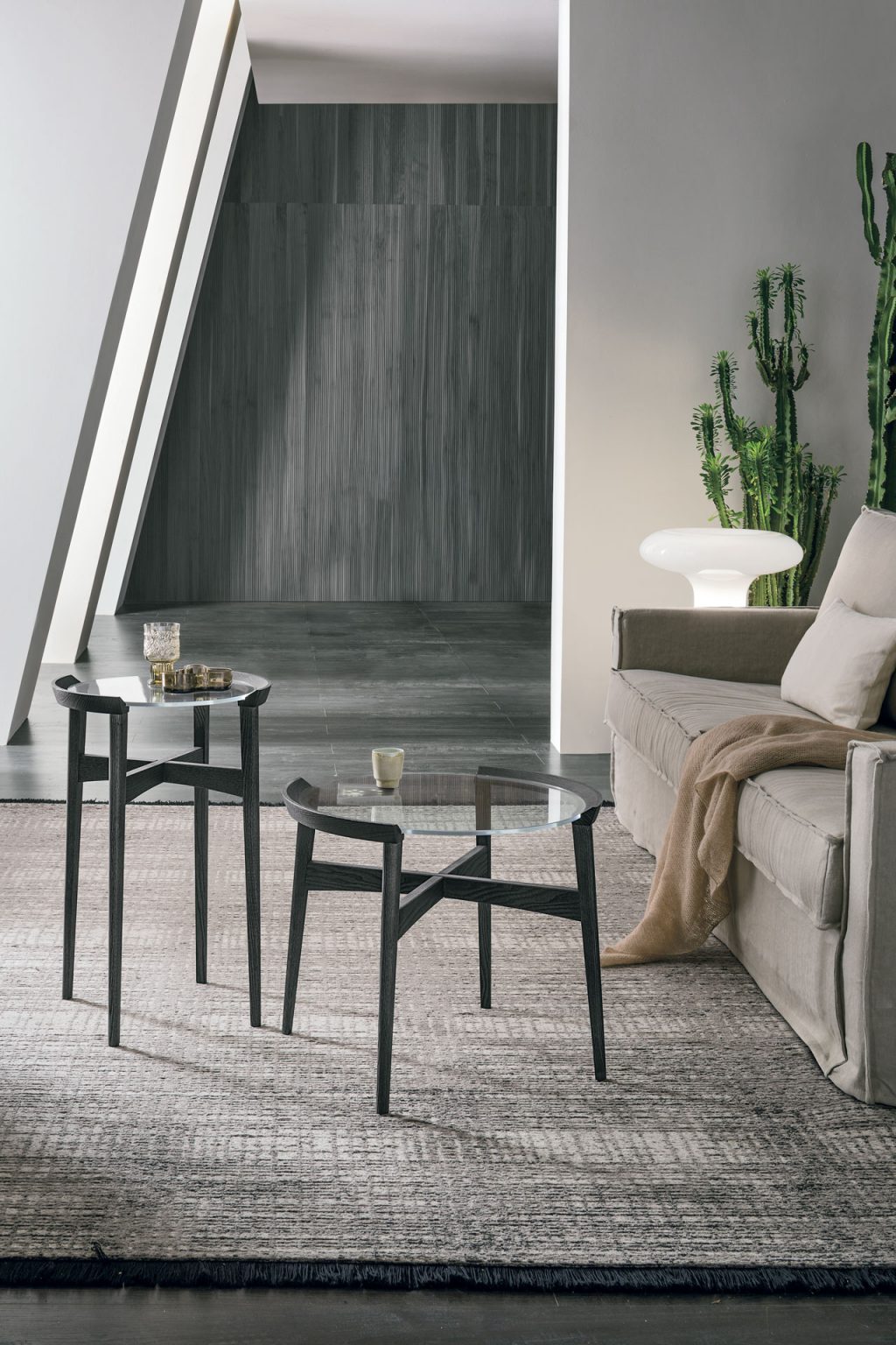 A collection of refined, extremely elegant coffee tables with a wooden frame that supports and encases a transparent glass top. The harmony of the materials and the balance of their combination give shape and substance to a charming accessory.