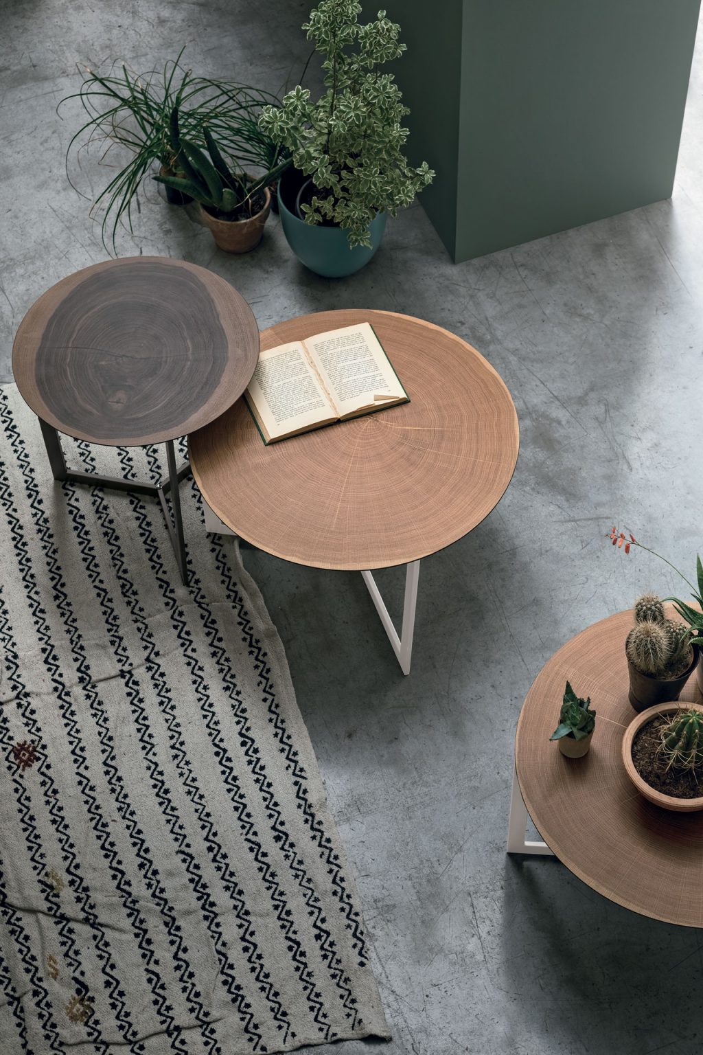 A coffee table that brings a small piece of nature into your home: the top recalls the beauty of wood, its grains and tones. Lovely to look at and touch, it makes corners comfy and spreads harmony through the room.