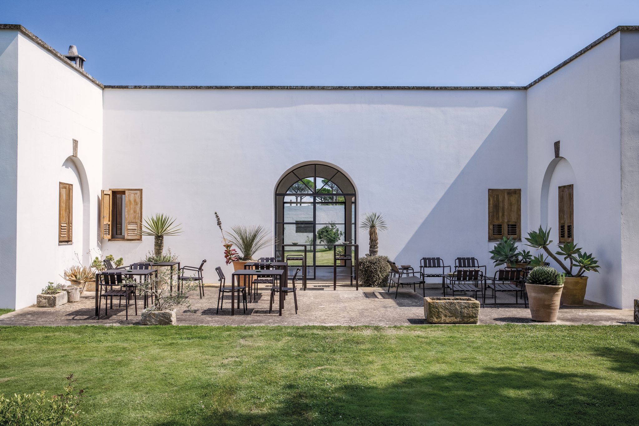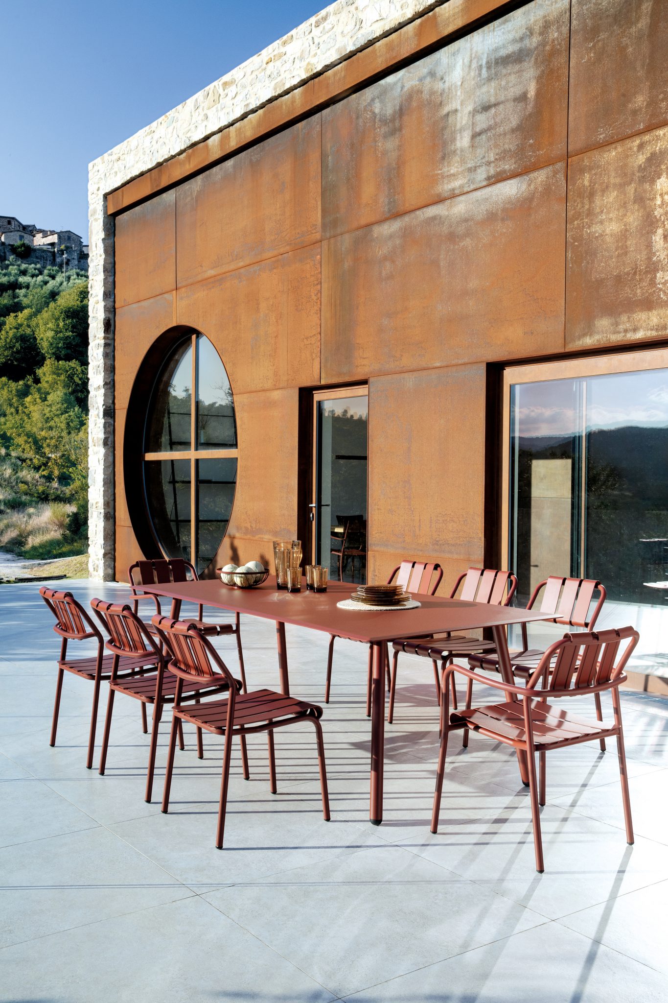 طقم طعام خارجي عصري فاخر من Verdea يتميز بتصميم أنيق وبسيط. تتميز الطاولة والكراسي بتصميم موحد، مع خطوط صلبة يتضمن الطقم طاولة كبيرة مستطيلة الشكل، محاطة بكراسي ذات إطارات معدنية مع ظهور ومقاعد ذات شرائح مضلعة مما يخلق مظهراً متوازناً يدمج بين الأناقة والراحة. يبدو الإعداد الخارجي مثالي للتراس أو الفناء الخارجي، مما يوفر مكاناً مثالياً لتناول الطعام في الهواء الطلق أو التجمعات في الهواء الطلق. يضيف المبنى النظيف المصمم على الطراز الصناعي بنوافذه الكبيرة وألوانه الترابية إلى الأجواء العامة العصرية والمتطورة.