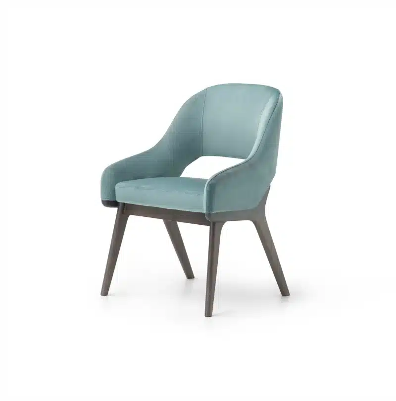 The aesthetics of the armchairs of the 1950s is the starting point for this line of chair and armchair, being reinterpreted under the canons of contemporary Scandinavian design. The language of the middle of the last century appears in the characteristic shapes. A generous backrest, which descends in a diagonal curve to the arms, revealing a hollow at the back of the piece.