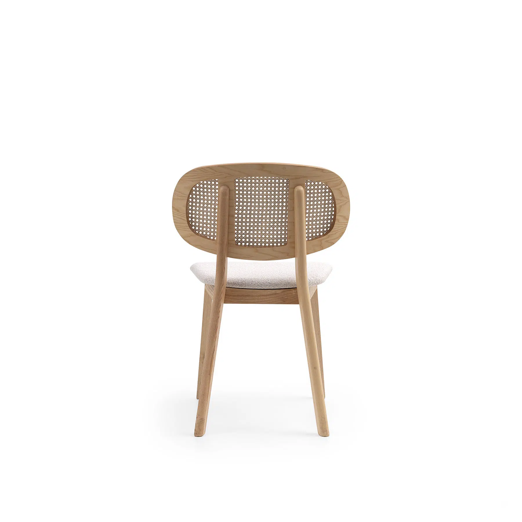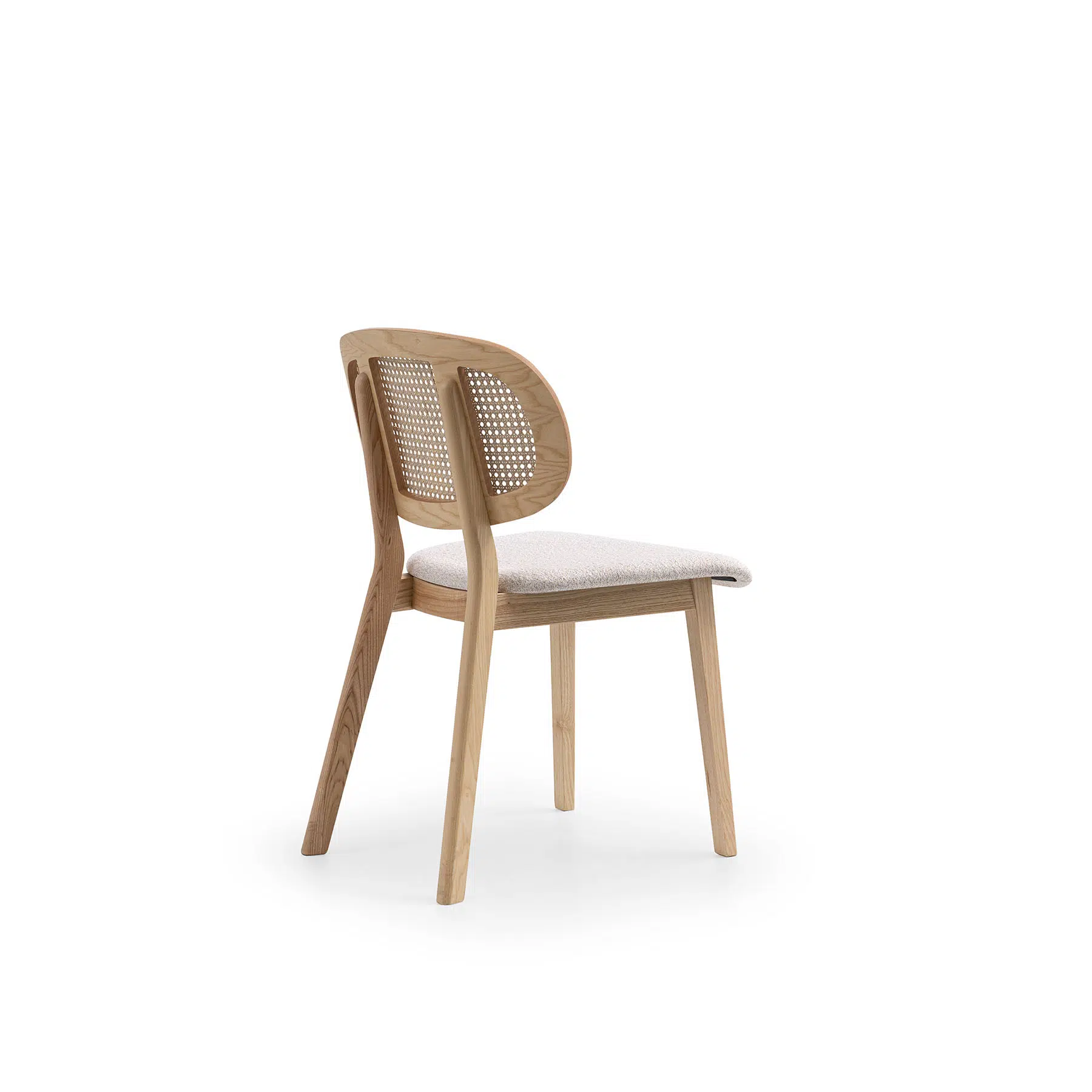 Viena Chair features a handwoven natural cane backrest that lends an airy, artisanal touch while ensuring visual lightness. Its solid wood structure provides durability, and the upholstered seat adds inviting comfort ideal for dining rooms, cafés, or refined contract spaces. Every detail reflects European artistry and balance between function and beauty.