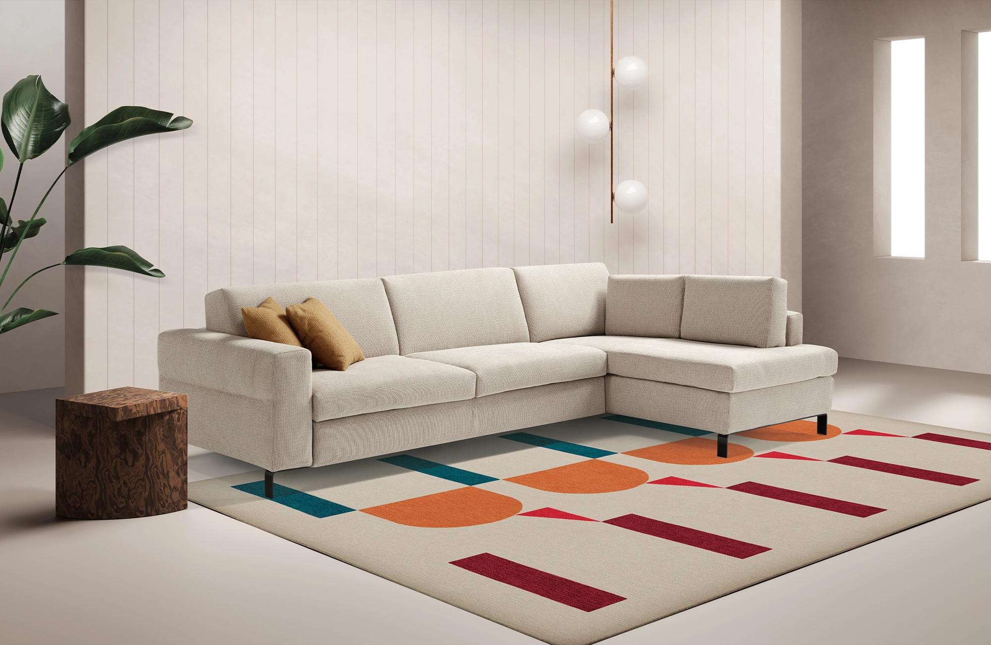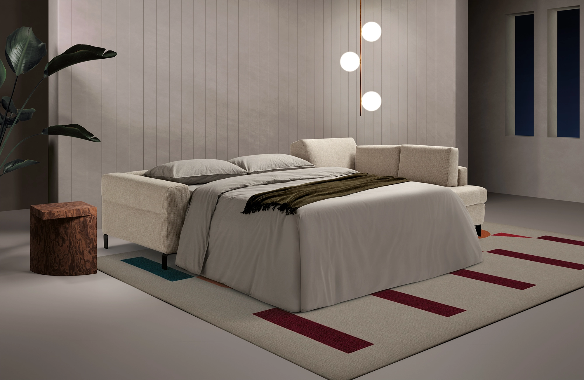 Sectional sofa bed with meridienne element. The 13-cm, 210-cm-long mattress provides prolonged rest in a design that combines functionality and style.
