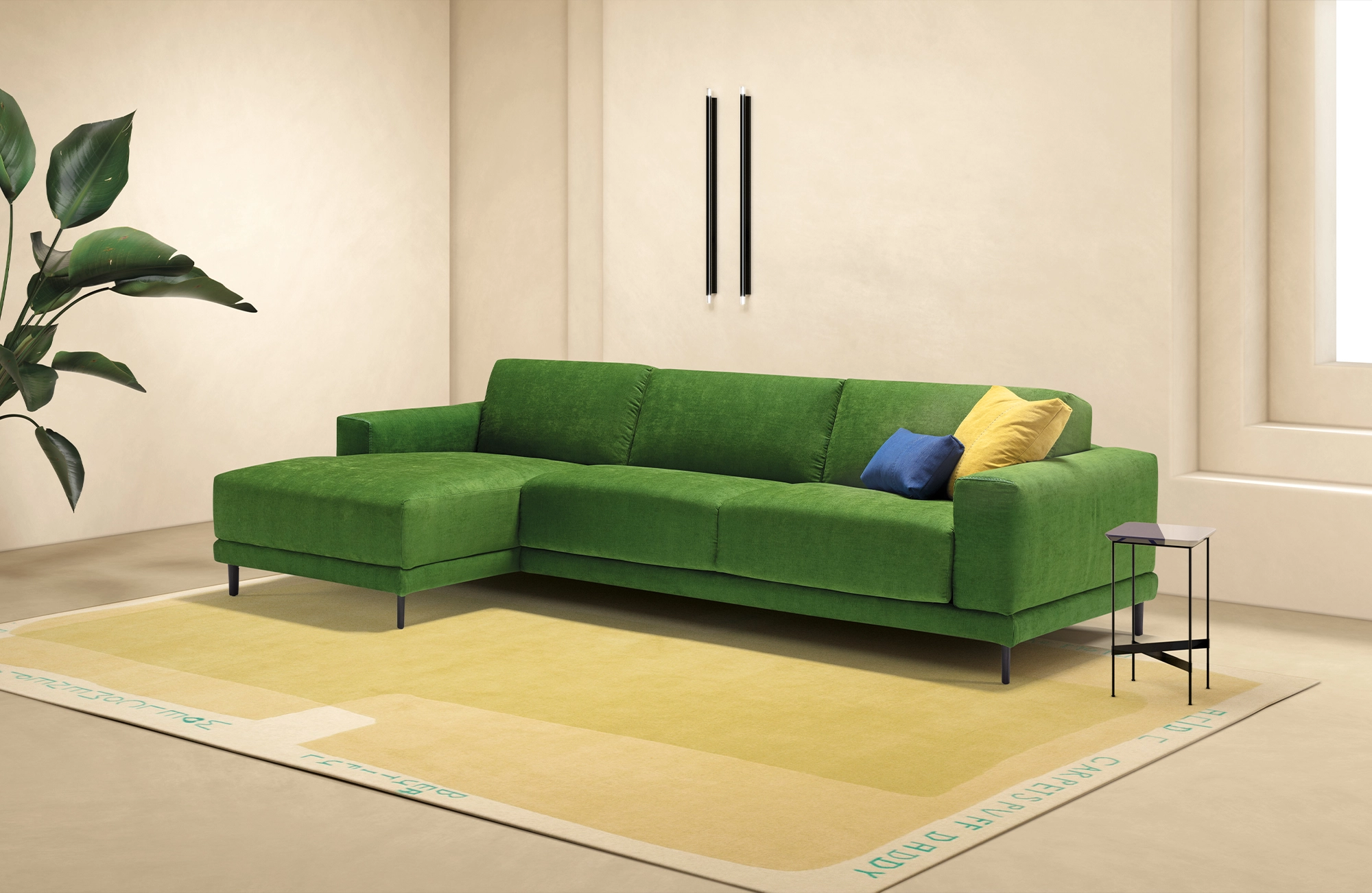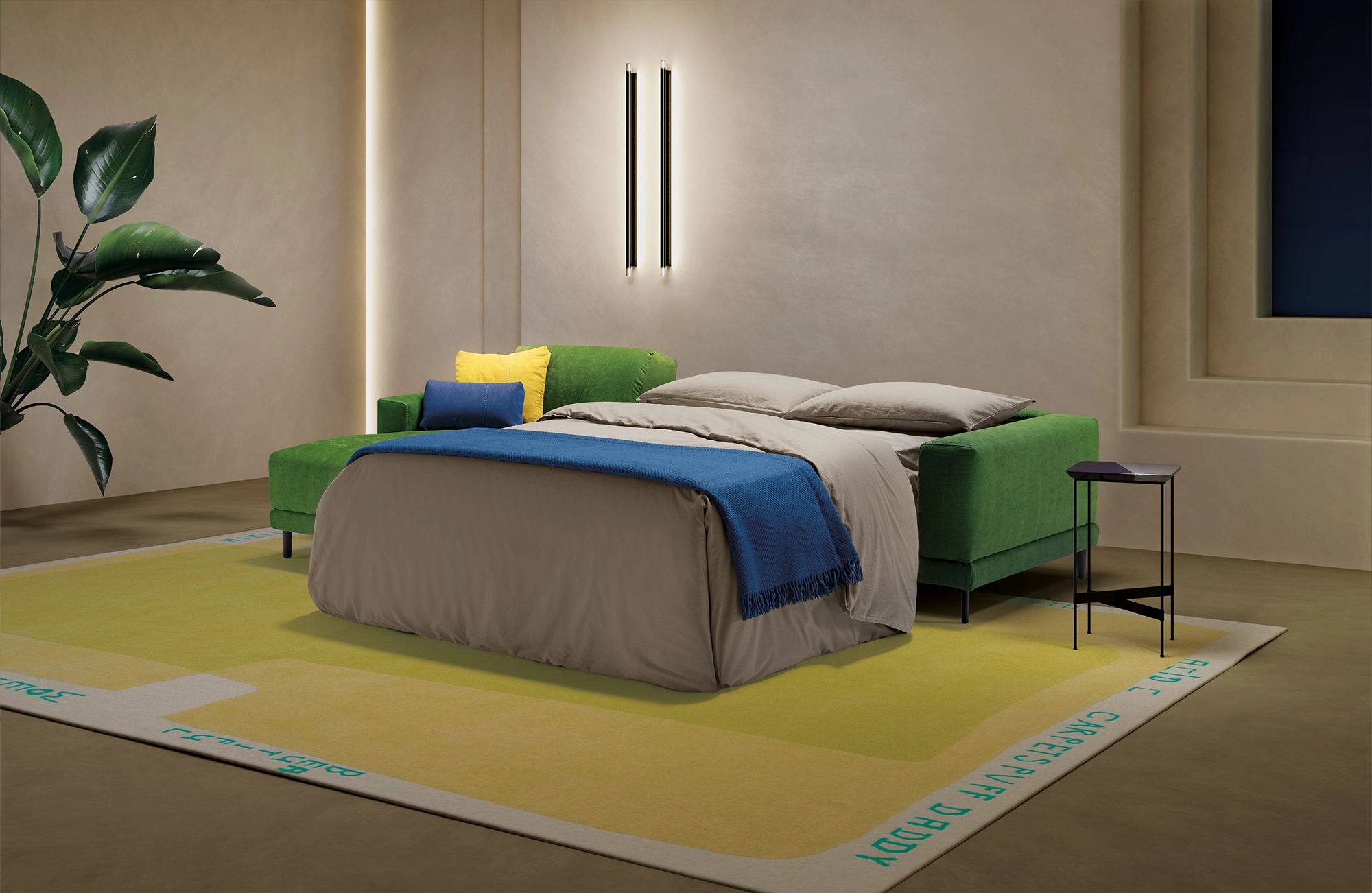 Sectional sofa bed with chaise longue element, offering a versatile and refined solution. The 13 cm mattress ensures optimal rest.