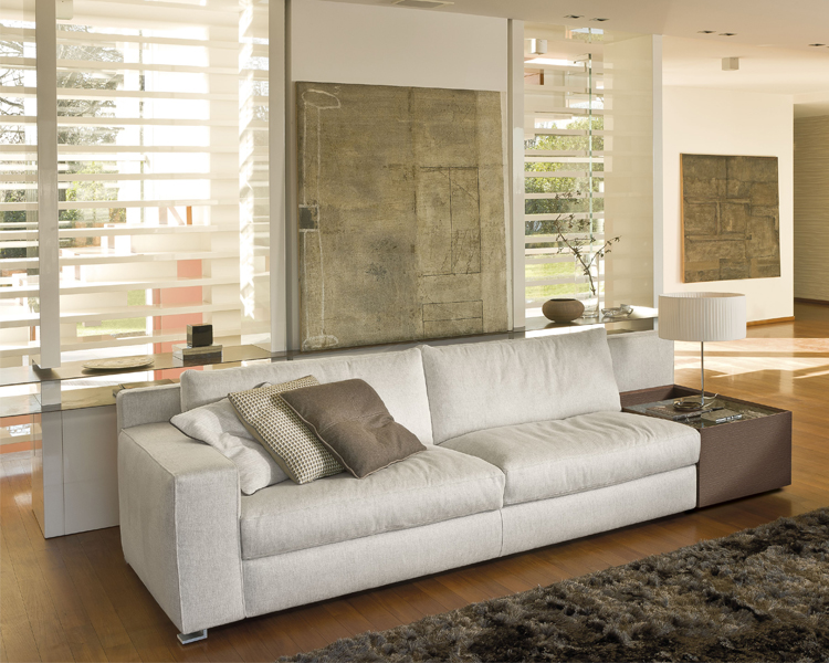 Roger is a removable seating system of great compositional versatility and unparalleled comfort thanks to the back support pad placed behind the back cushions. The linear design is characterized by a color or tone on tone profile that enhances the fabric upholstery.
