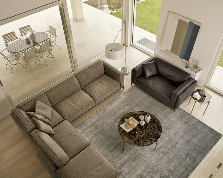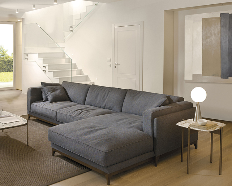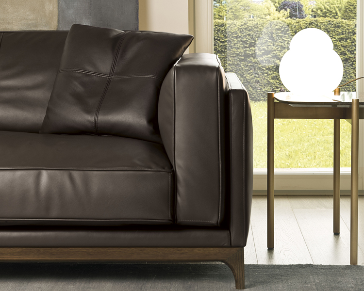 Time, design by Marconato&Zappa, is a refined and elegant modular sofa whose cushions are embellished with drawstring stitching. Comfort, a key feature of the CTS hand-crafted sofas, is guaranteed by the double-density polyurethane padding whose flexibility is ensured by intertwined elastic straps. For those wishing to further increase its softness, a sterilised goose feather cushion can be inserted into the seat. The durability of this sofa is guaranteed by its supporting structure made of solid fir and plywood and by the removable cover (in the case of fabric upholstery). You can completely renew the sofa after 5-10 years of use, at a small cost, by replacing the covers with new fabric according to current trends. The solid wood base is available in a variety of colours.